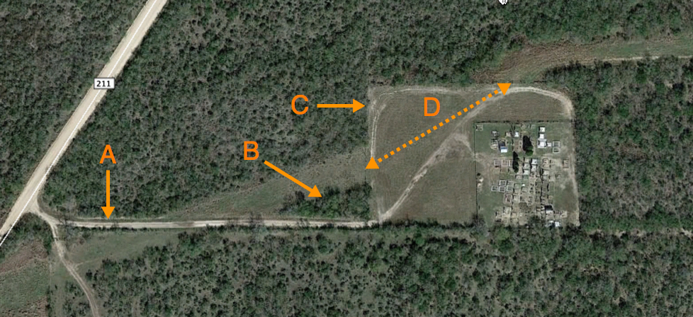 C = Brush will be cleared all around the current barbed-wire fence line, and the fence will be taken down, in preparation for installing a new fence. New net-wire fencing will be installed soon to keep hogs and other animals out so that more of the cemetery area can be used for burials.